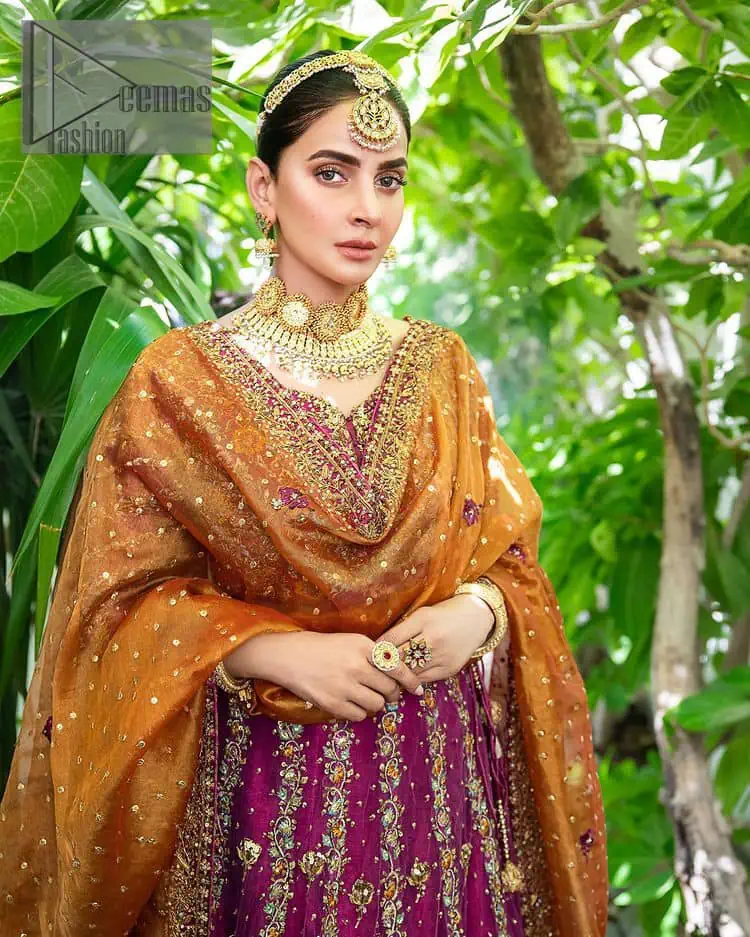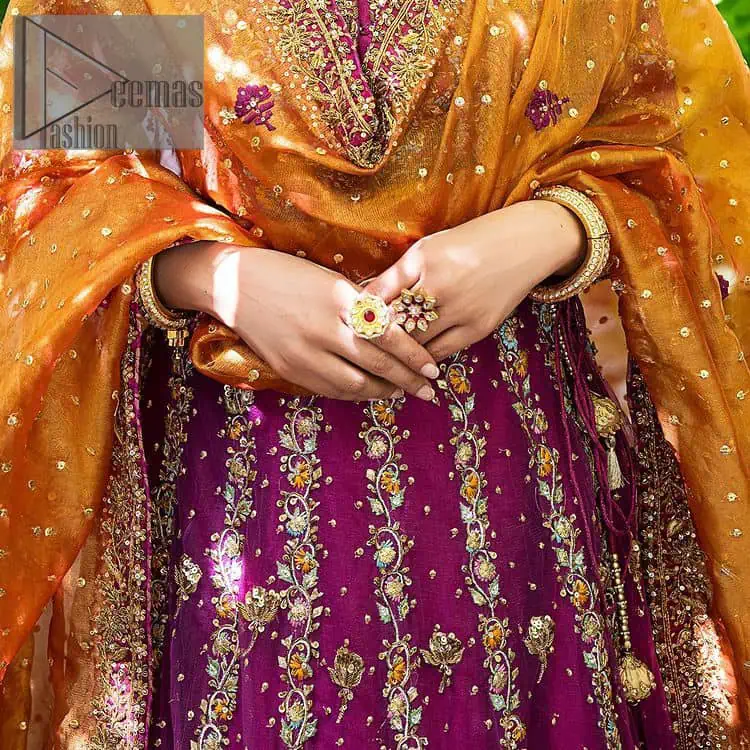 The outfit defines the true essence of allure with its spellbinding magenta hue and intricate details for the mehndi bride. The blouse is decorated with golden embroidery based on the neckline and sleeves. The sleeves are further enhanced with the embellished handwork. It is beautifully organized with a magenta lehenga that is again heavily embellished with golden embroidery that is just adding poise to the whole look. Paired along with an orange dupatta decorated with subtly adorned motifs and embellished border that is completing this Mehndi looks wondrously.