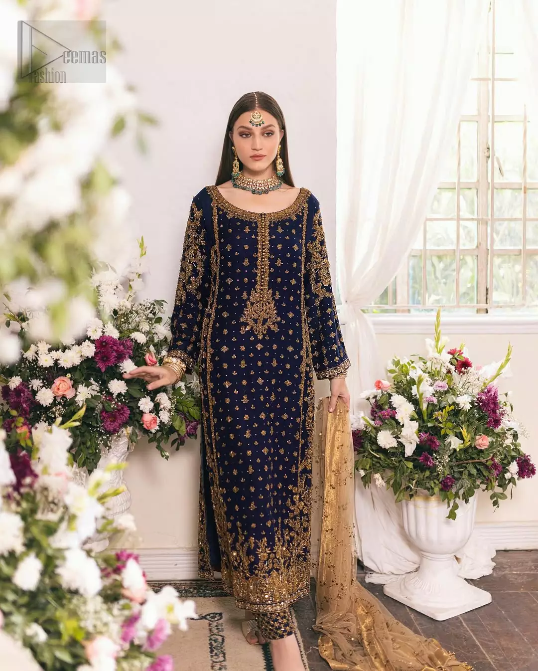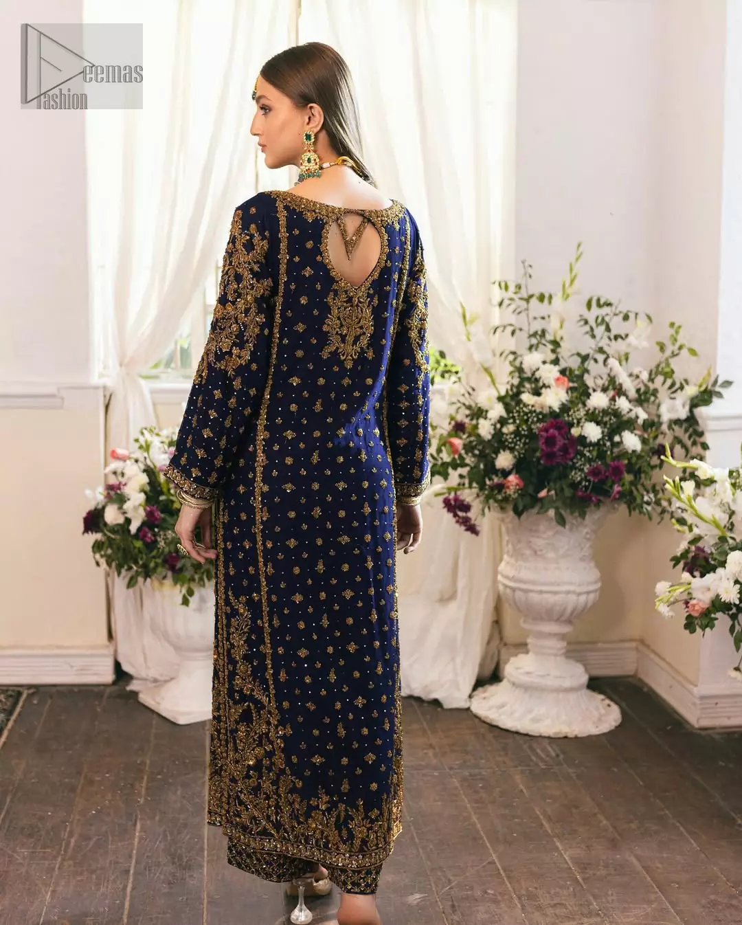 This midnight-blue long shirt is paired with culottes and a soft fawn dupatta to create a clean, balanced party look. The raw silk shirt features golden embroidery that stands out calmly against the navy base, supported by full sleeves and a round neckline that keeps the design structured and refined. The culottes add ease without taking away from the long-length silhouette. This ideal combination gives the outfit a modern and steady flow. The net dupatta in fawn tones softens the contrast and ties the colours together. It’s a simple but composed ensemble suited for evening events where understated elegance works best.