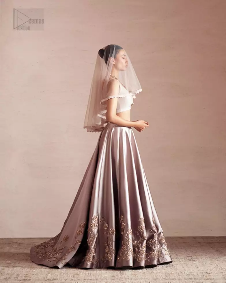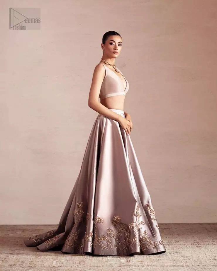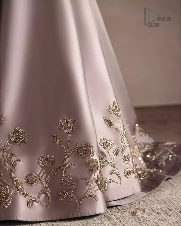 The oyster pink blouse comes with a beautiful back train lehenga to make your evening magical. The ensemble features light golden embroidery, a gentle, simple touch that aligns with the attire’s refined aura. It’s crafted from pure silk, giving it a royal appearance. While it’s sleeveless and has an elegant V-neckline, the overall combination is a treat to wear and adore. A soft touch of its net dupatta adds to the ensemble’s awesomeness which makes it ready to be worn on Nikah and wedding celebrations. The overall drape and movement of the ensemble are designed for grace, ensuring comfort alongside its stunning appearance. Every detail, from the embroidery to the flow of the net, is crafted for a memorable celebration.