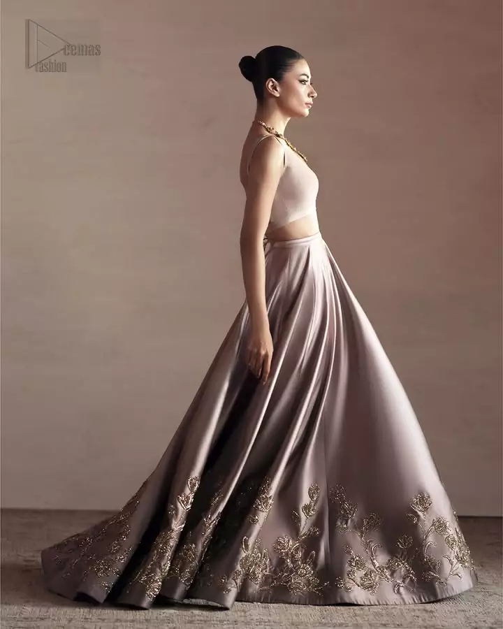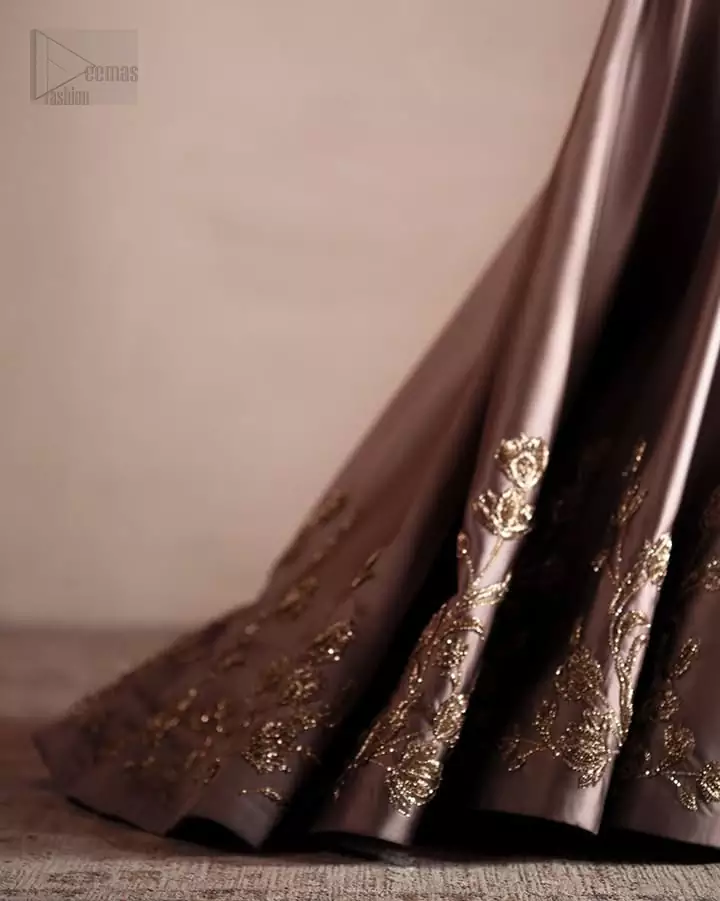 The oyster pink blouse comes with a beautiful back train lehenga to make your evening magical. The ensemble features light golden embroidery, a gentle, simple touch that aligns with the attire’s refined aura. It’s crafted from pure silk, giving it a royal appearance. While it’s sleeveless and has an elegant V-neckline, the overall combination is a treat to wear and adore. A soft touch of its net dupatta adds to the ensemble’s awesomeness which makes it ready to be worn on Nikah and second day celebrations. The overall drape and movement of the ensemble are designed for grace, ensuring comfort alongside its stunning appearance. Every detail, from the embroidery to the flow of the net, is crafted for a memorable celebration.