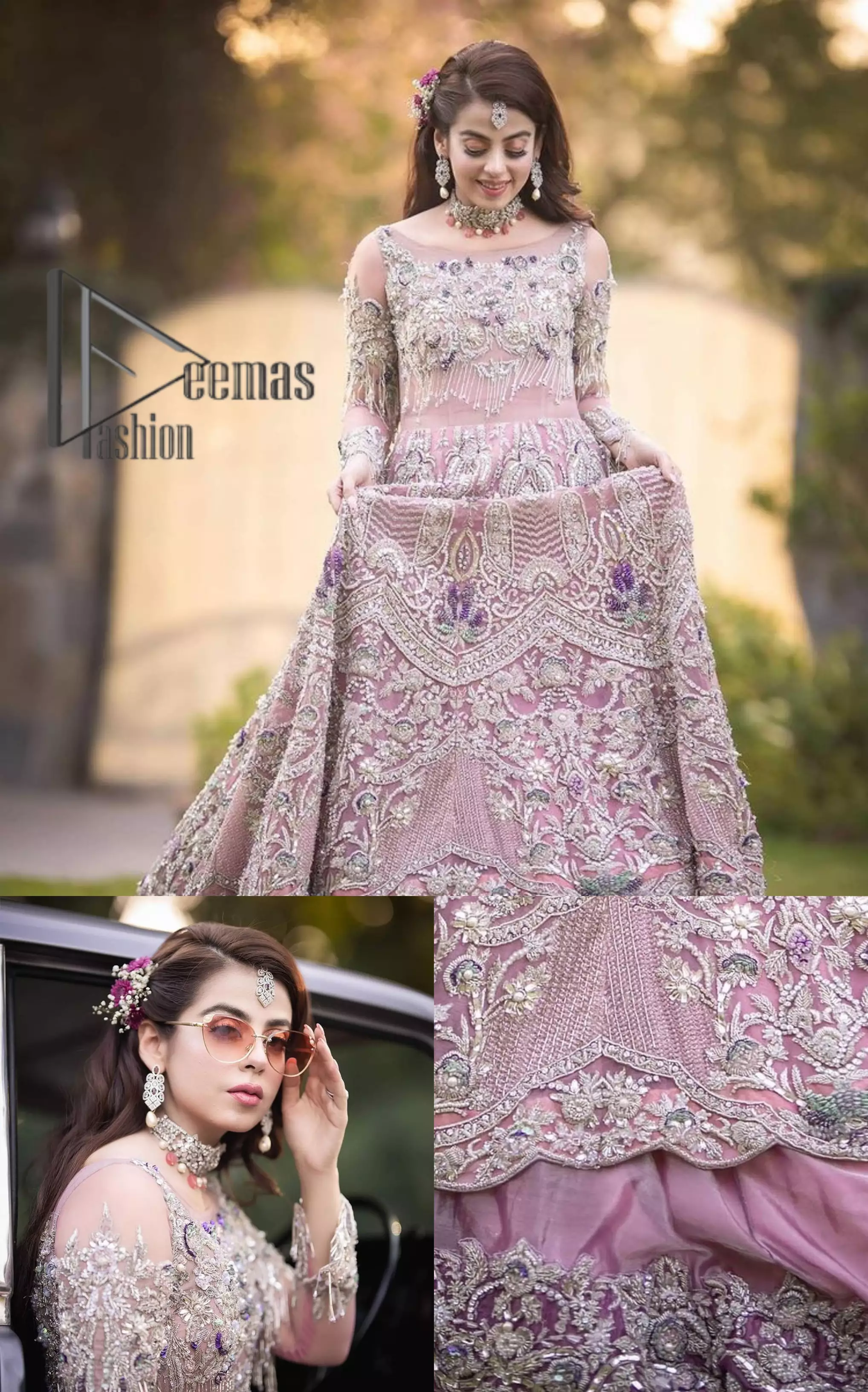 If you want to go high on the fashion charts, wear this pink outfit from Deemas Fashion. This full-sleeved pink pishwas is certainly any girl’s dream. That is fully embellished with multiple colour thread embroidery and silver zardozi work that includes kora, dabka, and crystal work to get a cool look. Furthermore, the boat-shaped neckline of this pishwas is just increasing the focus of this article. It is synchronized with the back train frilled lehenga to enhance your beauty on any occasion.