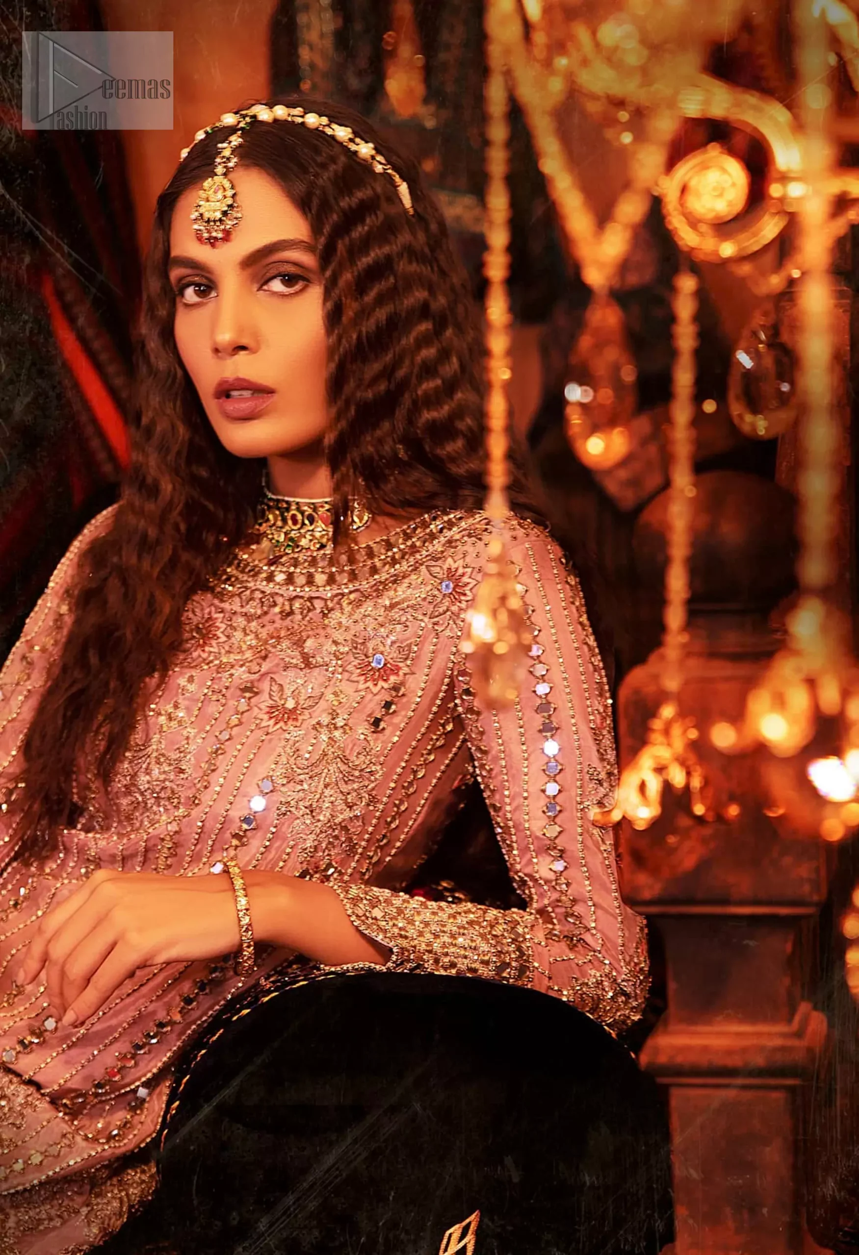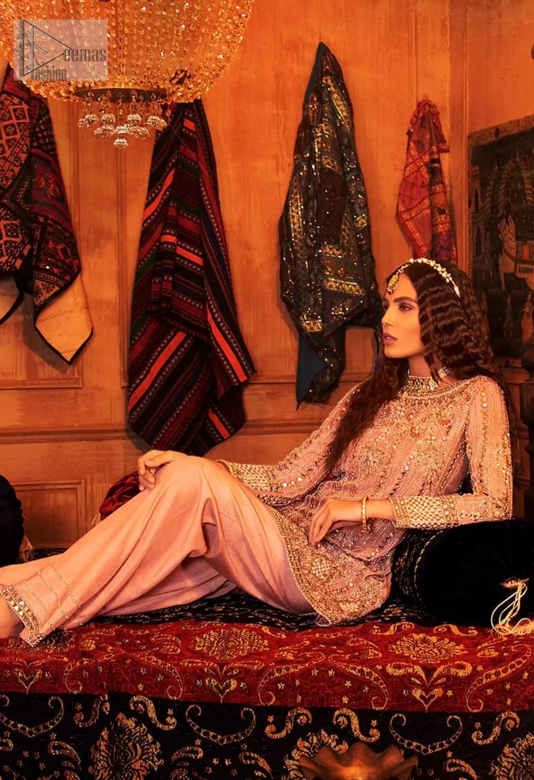 Step into timeless elegance with the Salmon Pink Short Shirt Palazzo Pants, an elegant choice for Nikah festivities. The soft salmon pink shade radiates a sense of femininity, while antique embroidery and mirror work weave a tale of tradition and grace. The stylish boat-shaped neckline and full sleeves create a sophisticated silhouette. Crafted from luxurious pure tissue silk, the flowing palazzo pants add a modern flair to this classic ensemble. This outfit is perfect for the bride who seeks a blend of tradition, elegance, and contemporary style.