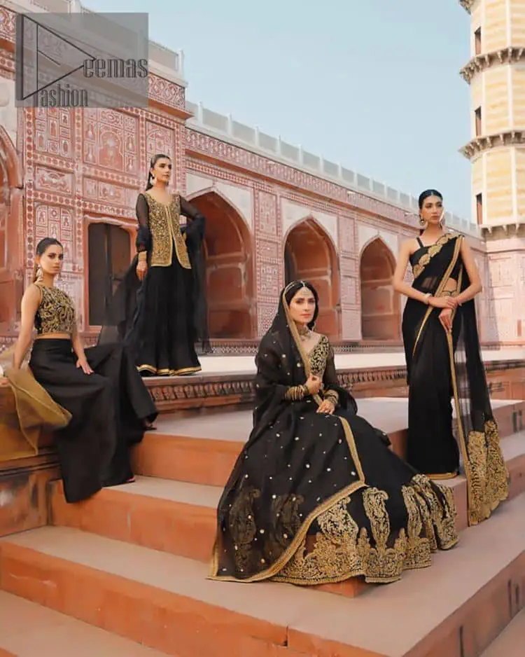 With the timeless charm of black so back on traditional flavour to steal everyone’s heart. Introducing the black jacket that is the epitome of splendour with delicate details beautifully decorated with golden colour. The bodice of the jacket is enhanced with stunning embroidery with worked finishing of tilla, kora, dabka and zardozi. The addition of simple sleeves with V shape neckline can be done to make this super traditional. To complete this traditional jacket, a crushed sharara is added to give you an amazing look at any formal event. Complete this black outfit with a black dupatta in a plain style that is perfect for any intimate evening