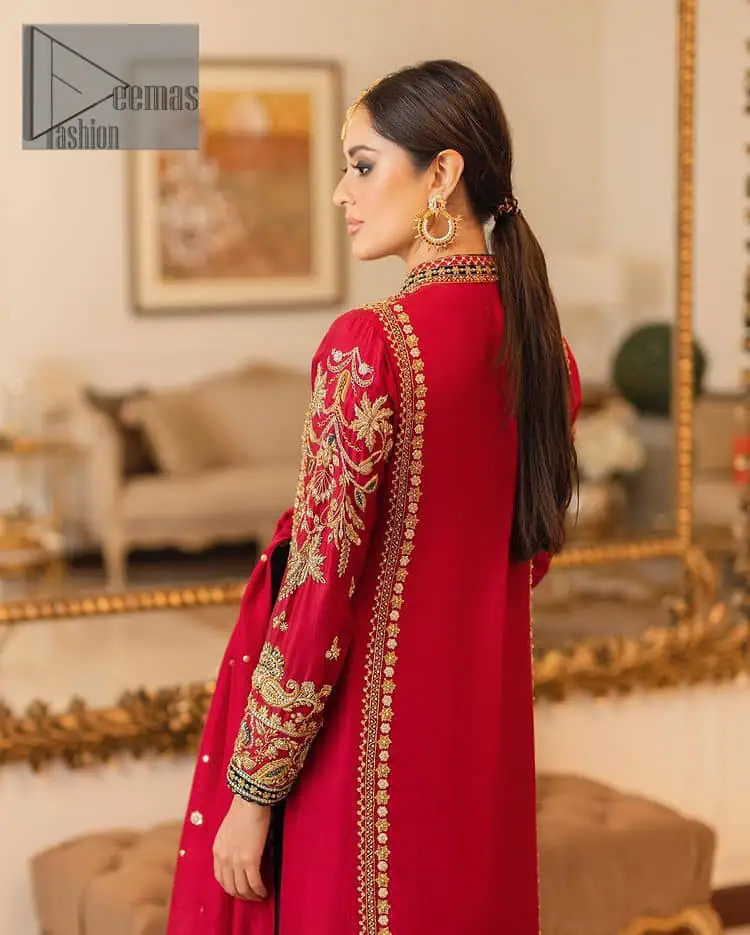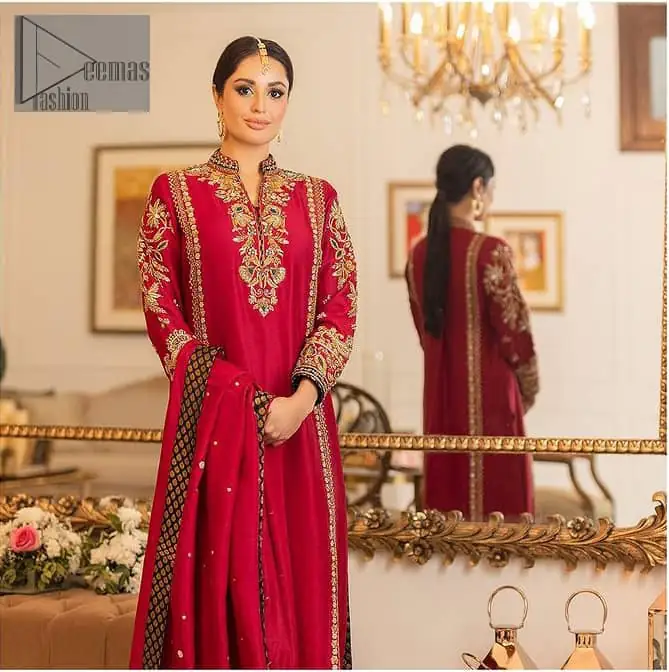 The forever favourite red dress is channelling your inner diva. A luxury long red shirt rendered with intimate embroidery in golden colour to make your party blazing and remembering. It is highlighted with tilla, dabka, kora, and pearls, the perfect blooming outfits in our collection. The collar neckline and full sleeves add attractiveness to the outfit. It comes with black pants for a more formal look at any precious event. The border of the pants is adorned with golden embroidery as well. End this look with a red dupatta embellished with a four-sided border, and sequins spray all over for your constant love of red.